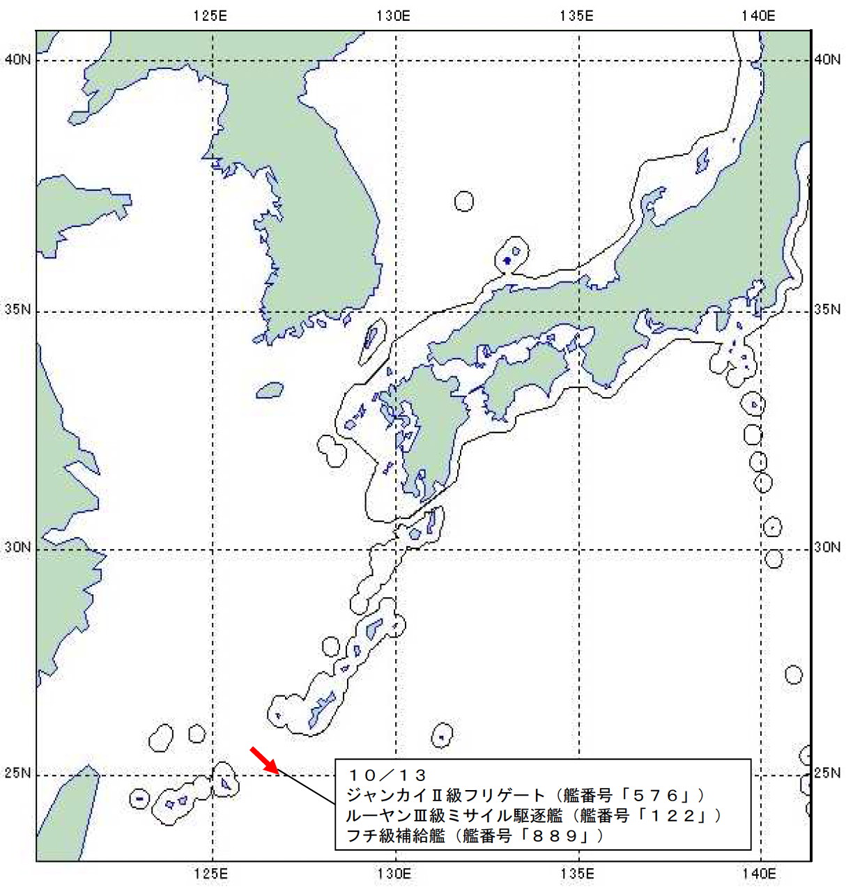 The three PLAN ships then sailed north in the waters between Okinawa and Miyako Island to enter the East China Sea. Japan Maritime Self-Defense Force (JMSDF) minesweeper JS Shishijima (MSC-691) and a JMSDF P-3C Orion Maritime Patrol Aircraft (MPA) shadowed the transit.